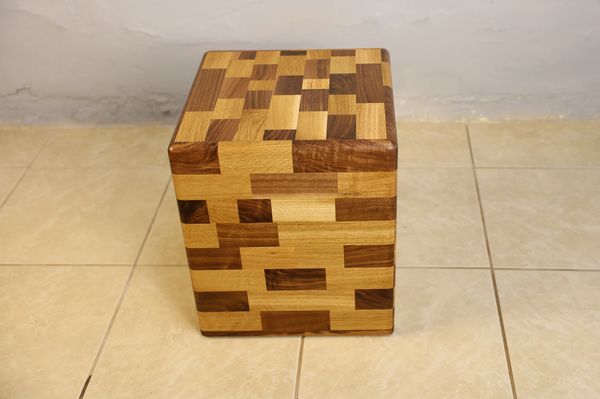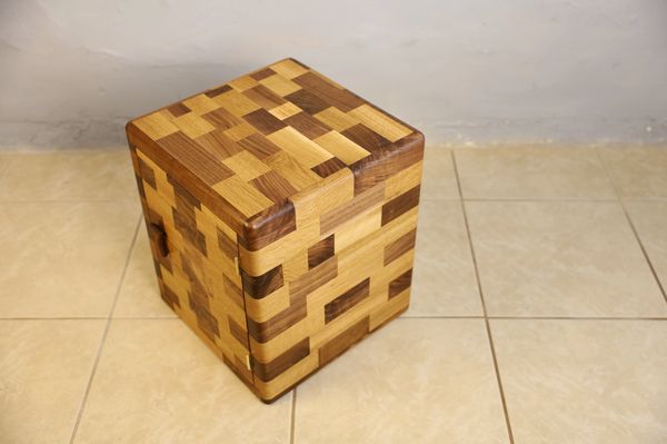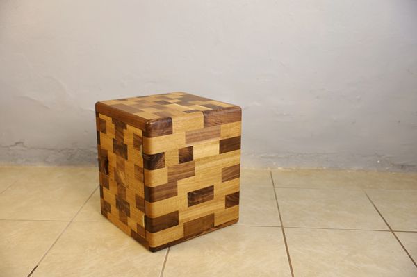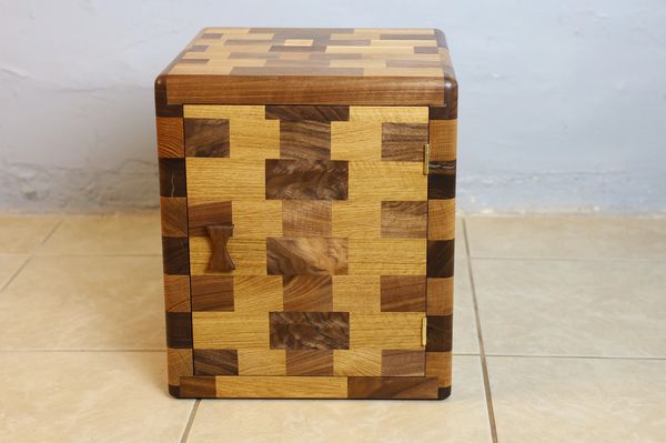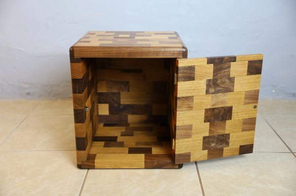 This handcrafted end-grain wood cube stand is more than just furniture — it’s a statement piece. Made from solid oak and walnut in a bold parquet pattern, it offers hidden storage with a sleek door design.